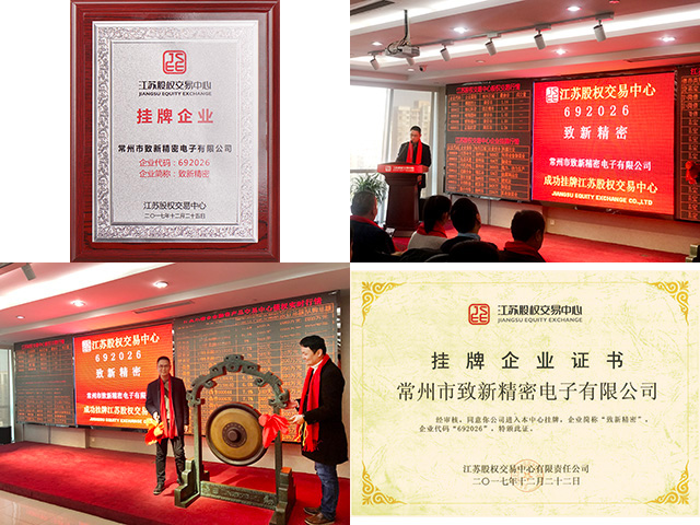 2018年1月11日下午,江蘇股權交易中心企業集中掛牌儀式隆重舉行。本次掛牌的共有38家企業,其中常州市致新精密電子有限公司(以下簡稱“致新精密”)成功掛牌成長板。掛牌儀式的成功舉行,要感謝江蘇股權交易中心對我司各方面實力的審計與認可。